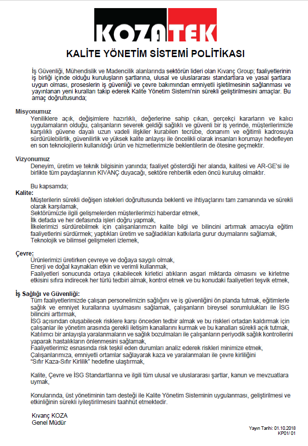 Deneyim, üretim ve teknik bilgisinin yanında, faaliyet gösterdiği her alanda, kalitesi ve AR-GE’si ile birlikte tüm paydaşlarının KIVANÇ duyacağı, sektöre rehberlik eden öncü kuruluş olmak..